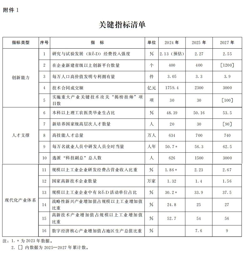 到2027年,全社会研发经费投入强度达到2.55%以上,战略性新兴产业增加值、高新技术产业增加值占规模以上工业增加值比重分别达到27%以上、56%以上,科技创新和产业创新融合发展路径更加明晰,产业创新体系更加完善,具有河南特色和优势的现代化产业体系竞争力明显增强。
