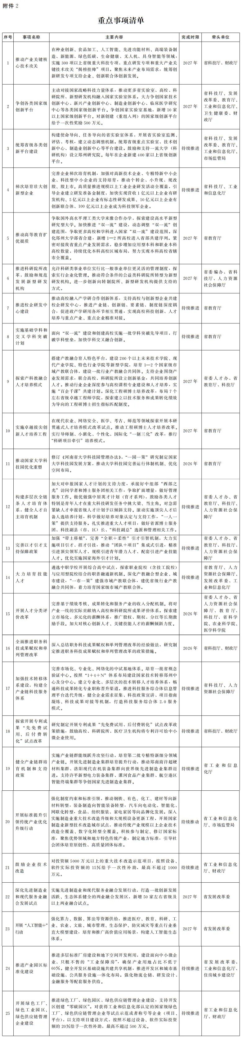 1.加强产业关键核心技术攻关。健全科技计划组织模式和管理机制,完善科学家本位和产业需求导向的科研组织体系,强化有组织科研。持续优化“揭榜挂帅”机制,探索重大技术协同攻关新模式。在种业创新、食品加工、人工智能、先进功能材料、高端装备制造、新能源、绿色低碳、生命健康、无人机、具身智能等领域实施300项以上省级重大科技专项、重点研发专项,集中突破一批产业“卡脖子”技术和行业关键共性技术。